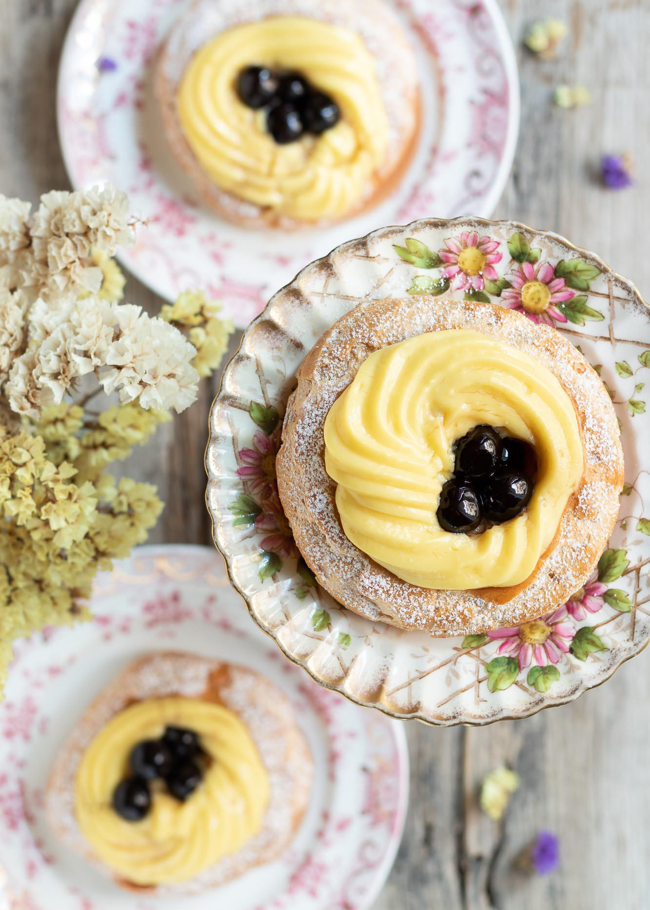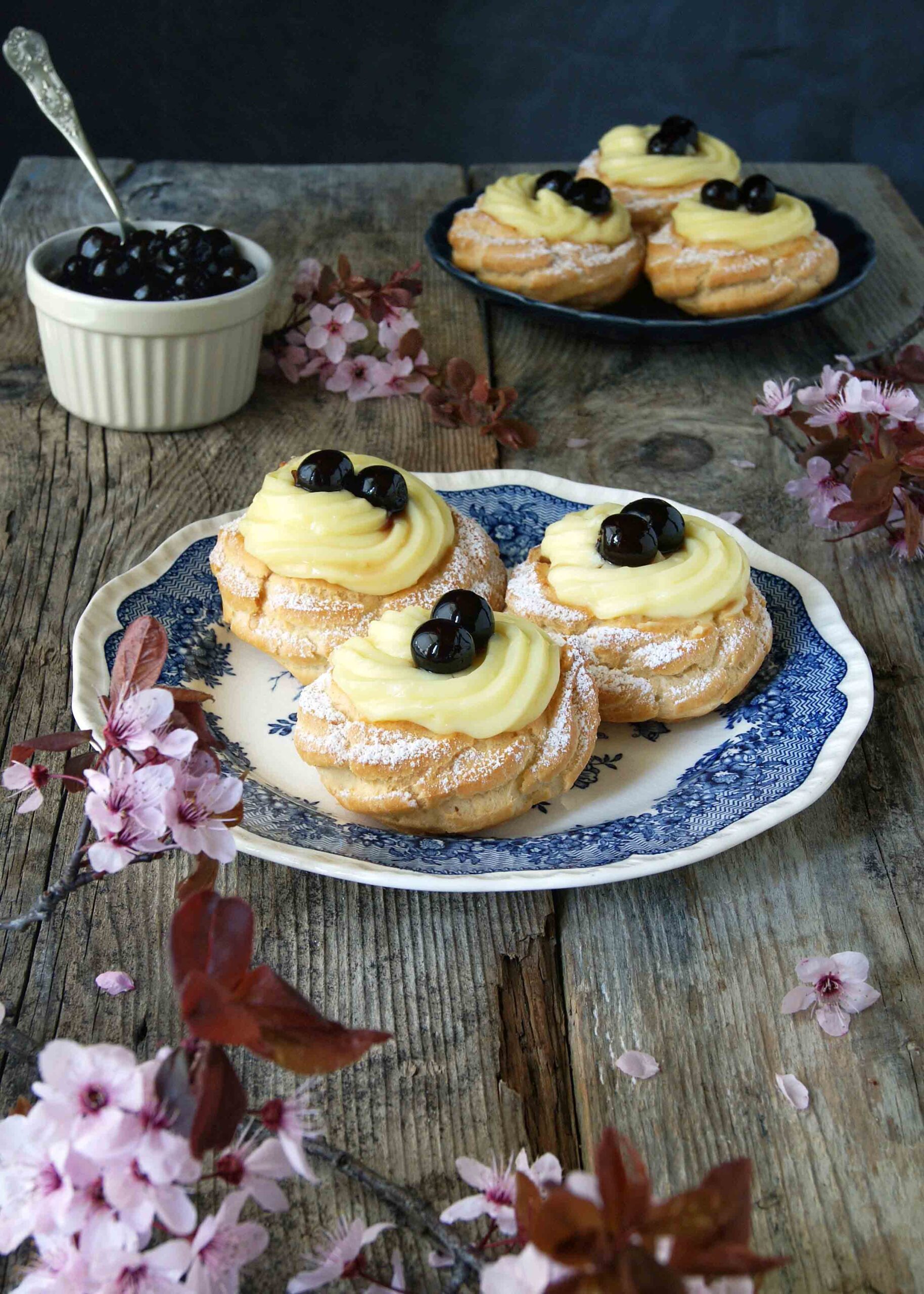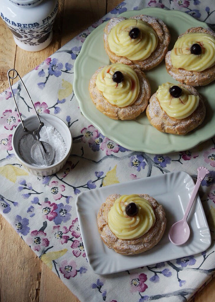 - Una volta fredde, completate le zeppole sulla parte superiore con la crema pasticciera (o diplomatica, aggiungendo alla crema anche la panna montata - io ne ho fatta una versione semimontata) e qualche amarena. Spolverizzate con zucchero al velo e servite.