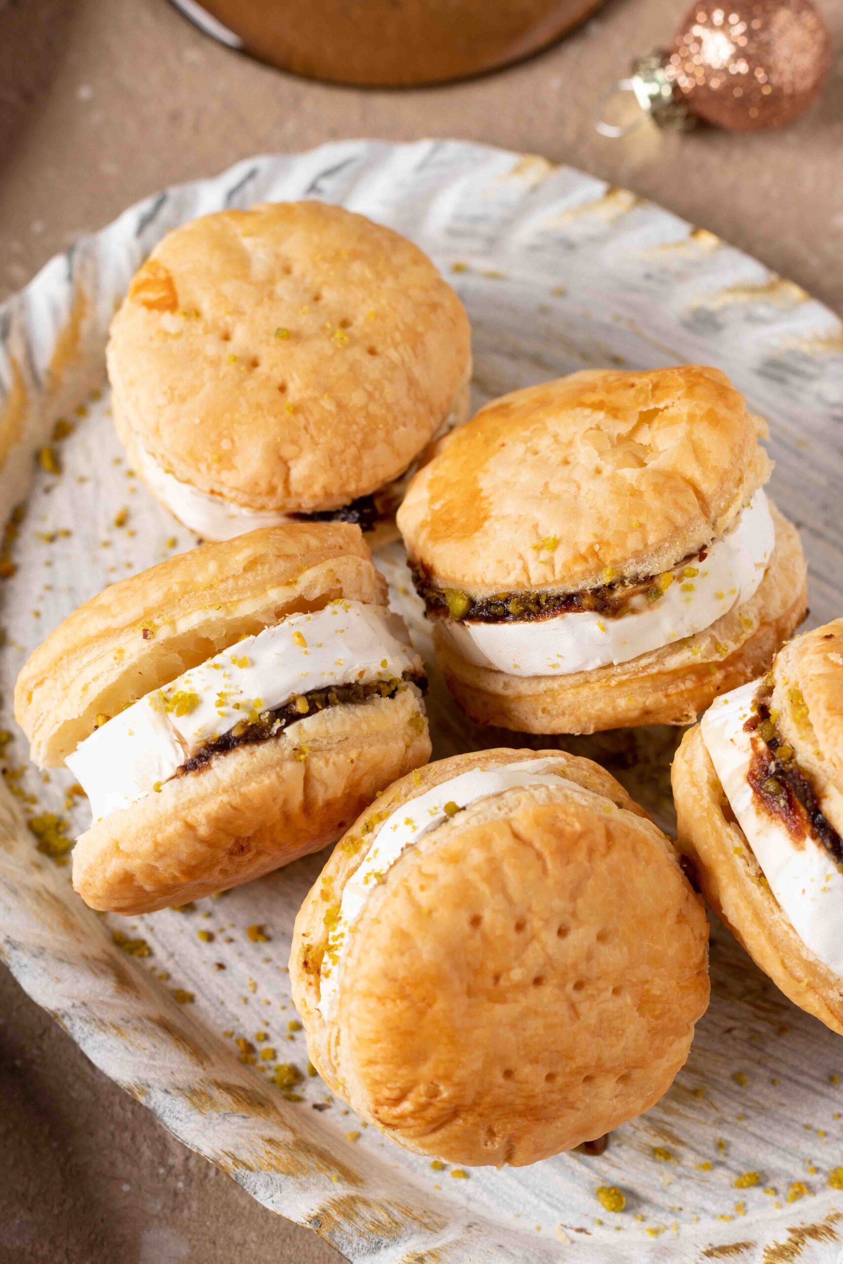 La seconda proposta, vegetariana, è una rivisitazione dei macarons in versione salata con pasta sfoglia (potete prepararla da voi oppure comprarla già pronta) farciti con chèvre, cipolle caramellate e pistacchi. Anche in questo caso la resa è carinissima nonostante la preparazione super basic! Non trovate?