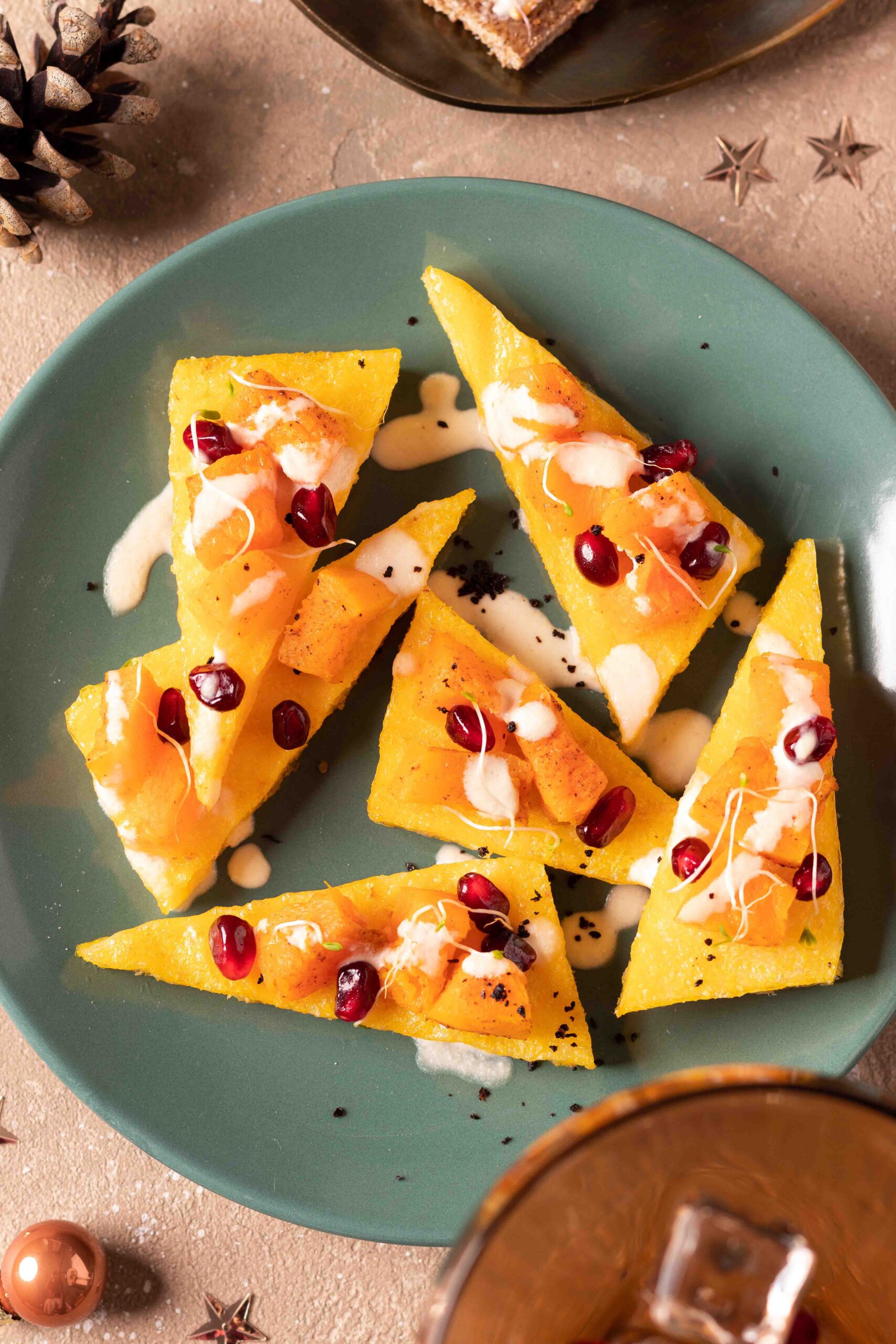 • Tagliate ora in obliquo ogni fetta di polenta per ottenere due triangoli, grigliateli ambo i lati su una piastra ben calda unta con poco olio evo, poi guarniteli con la dadolata di zucca al forno, i chicchi di melagrana e la salsa tahina al limone. Per completare, poco peperoncino urfa per una piacevole nota affumicata (in alternativa, pepe nero macinato al momento).