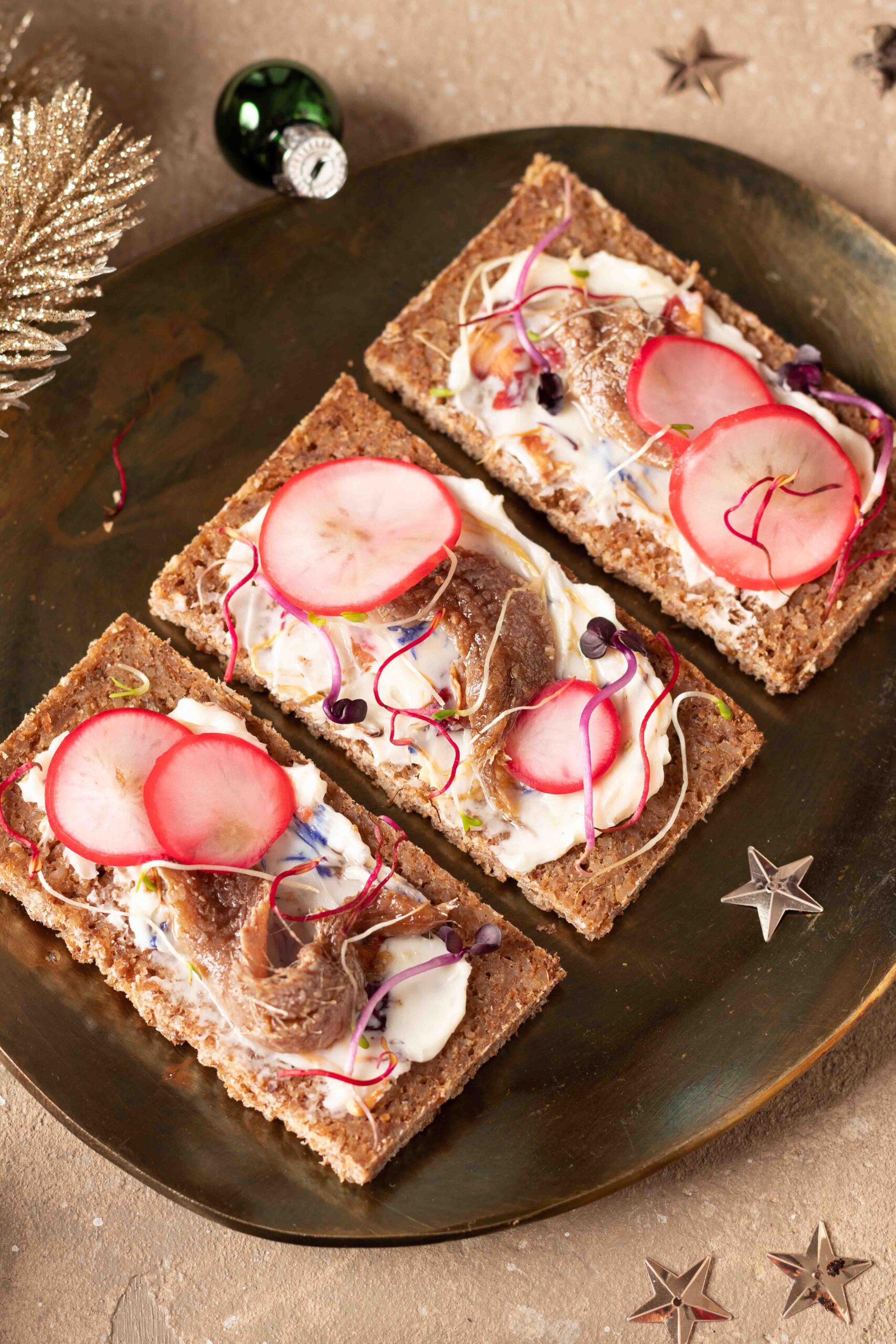 La prima proposta di questi antipasti per le feste sono delle tartine di segale con burro salato ai fiori eduli, acciughe e ravanelli croccanti all’aceto: una ricetta classica resa sontuosa e colorata con pochi e semplici accorgimenti. Piace sempre e anche in questa veste farà un figurone!