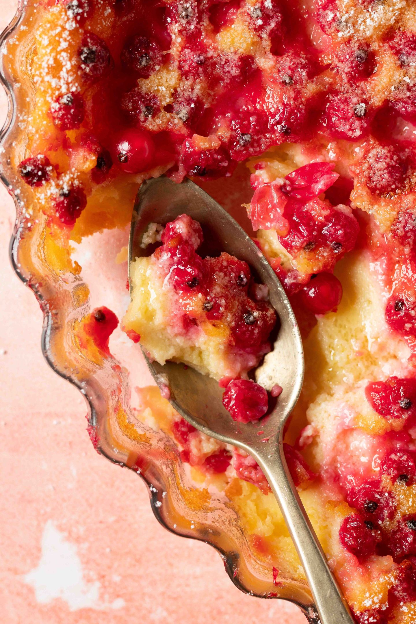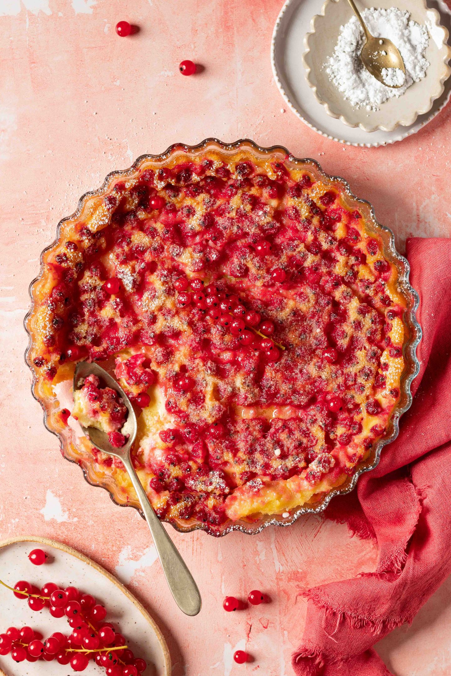 Conoscete questo dolce della tradizione francese? Il clafoutis è una sorta di crema cotta o budino al forno in cui affondare succosa frutta fresca di stagione. Si prepara solitamente con le ciliegie intere, ma io ve lo propongo in una scenografica variante con i ribes rossi… che lo trasformano in flaugnarde.